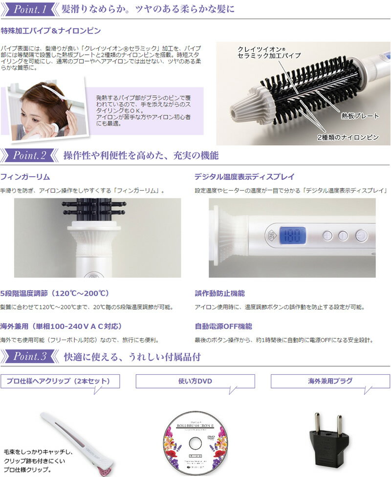 ■加工仕上:パイプ部:クレイツイオン®セラミック加工 ■自動電源OFF機能:最後のボタン操作から約1時間後に電源OFFクレイツ ロールブラシアイロンII ヘアクリップ(2本セット)/使い方DVD/海外兼用プラグ付属
